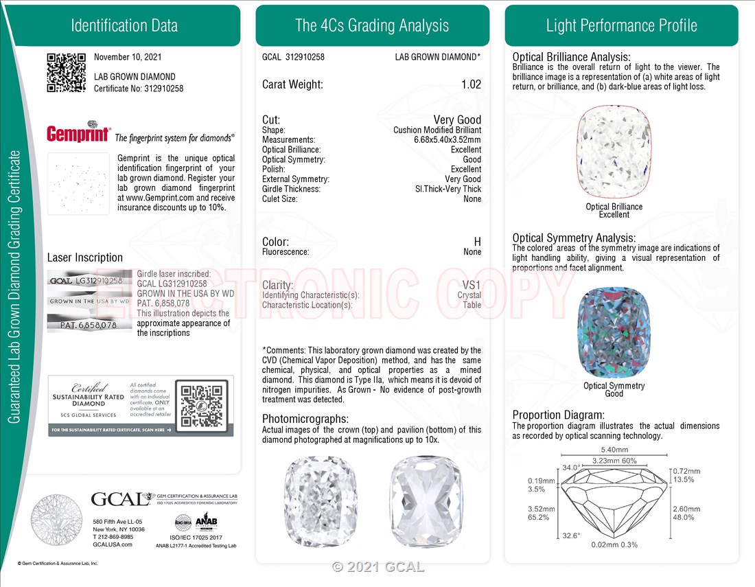 1.02 ct. H/VS1 Cushion Lab Grown Diamond