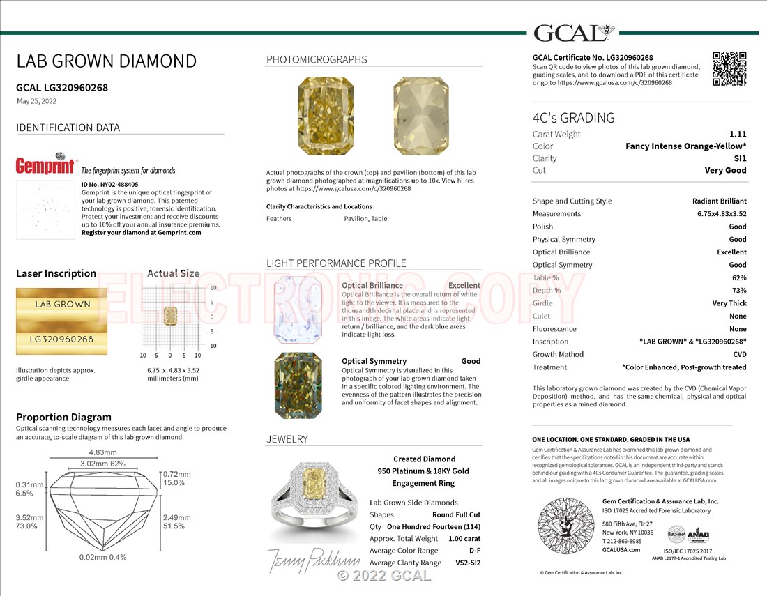 1.11 ct. Fancy Intense Orange Yellow/SI1 Radiant Lab Grown Diamond