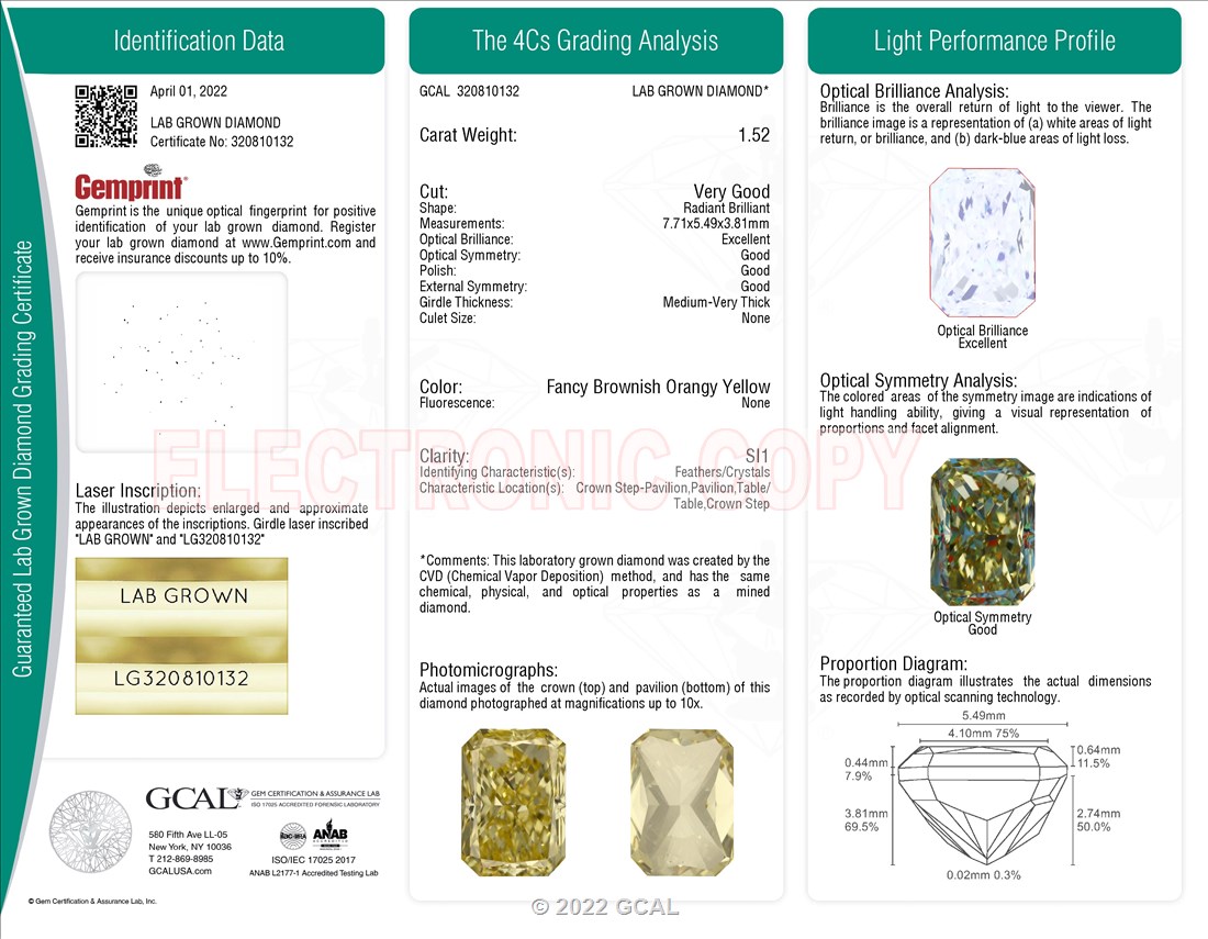 1.52 ct. Fancy Brownish Orangey Yellow/SI1 Radiant Lab Grown Diamond