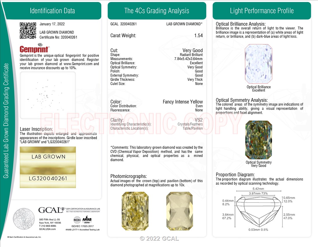 1.54 ct. Fancy Intense Yellow/VS2 Radiant Lab Grown Diamond