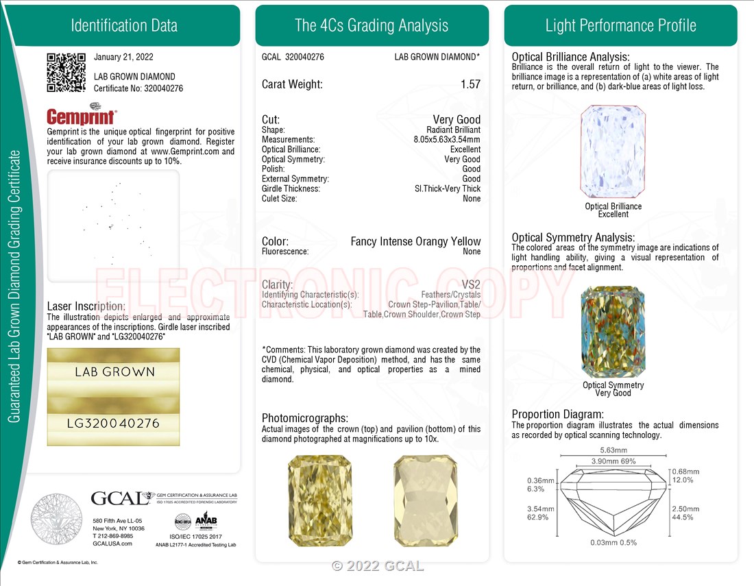 1.57 ct. Fancy Intense Orangey Yellow/VS2 Radiant Lab Grown Diamond