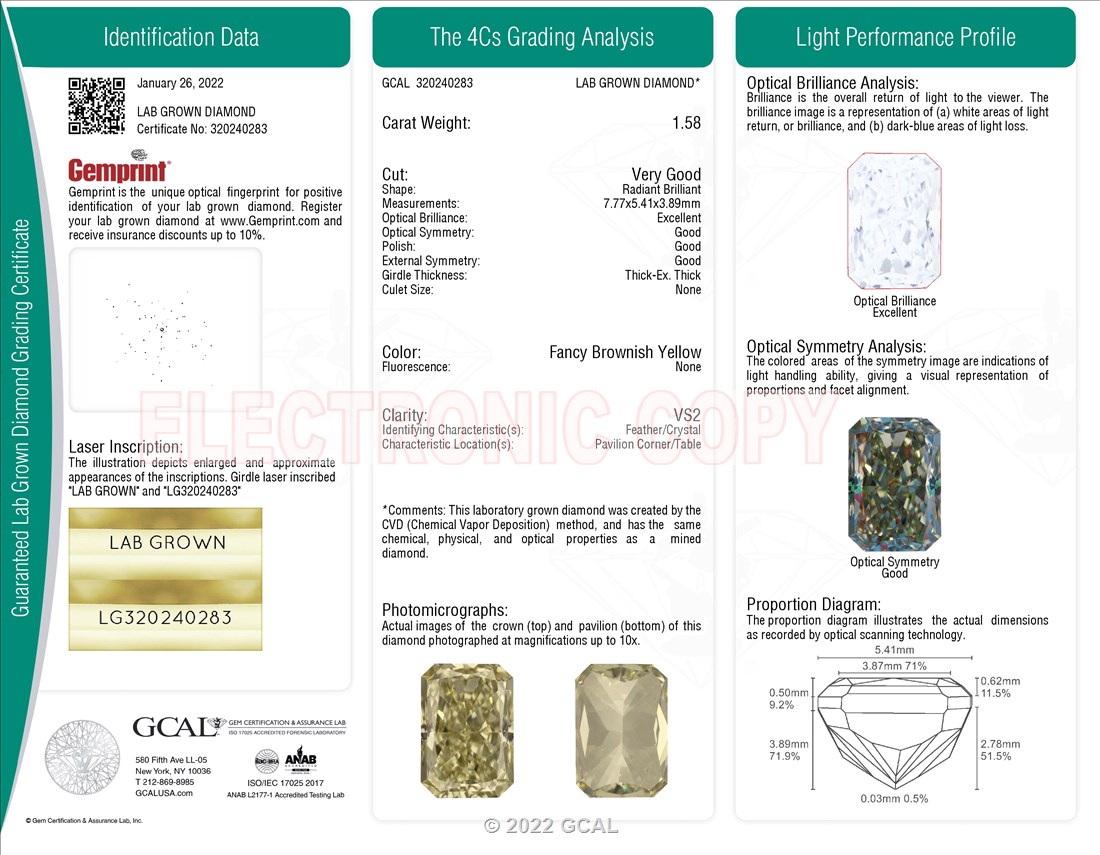 1.58 ct. Fancy Brownish Yellow/VS2 Radiant Lab Grown Diamond