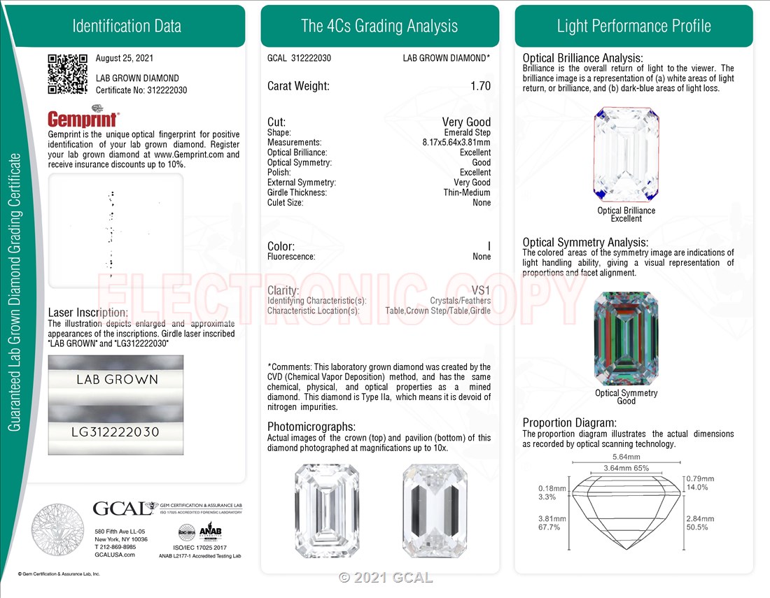 1.70 ct. I/VS1 Emerald Lab Grown Diamond