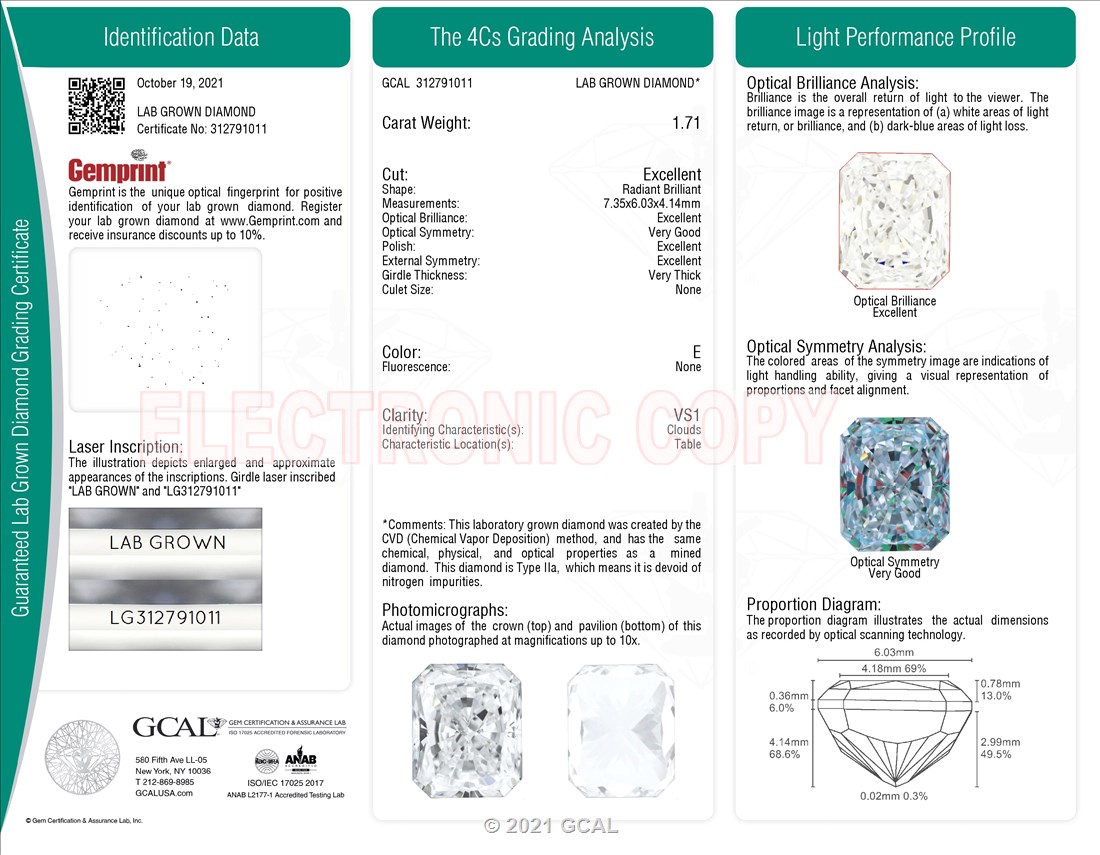 1.71 ct. E/VS1 Radiant Lab Grown Diamond