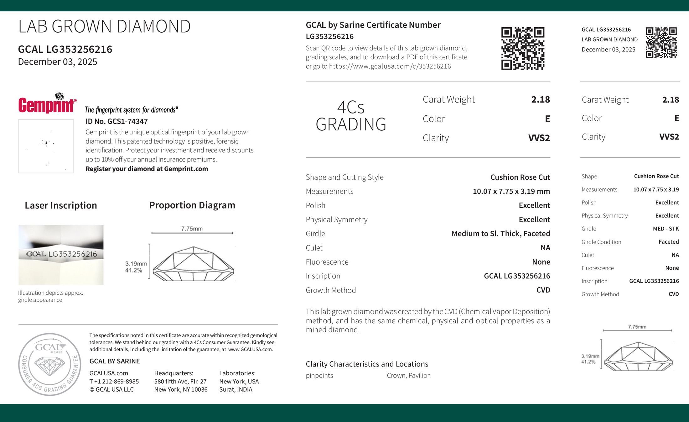 2.18 ct. E/VVS2 Cushion Lab Grown Diamond
